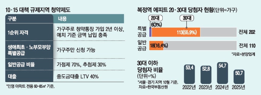 1순위 자격 요건이 대폭 강화된 것도 20·30대가 밀리는 요인이다. 규제지역 1순위 요건은 청약통장 가입 기간과 납입액이 강화됐을 뿐 아니라 '가구주' 조건이 추가됐다. 특공도 생애최초·노부모 부양은 가구주만 청약할 수 있다. 복정역 에피트 특공의 경우 가구원도 청약 가능한 신혼부부에서 30대 당첨자가 많았던 배경이다.
