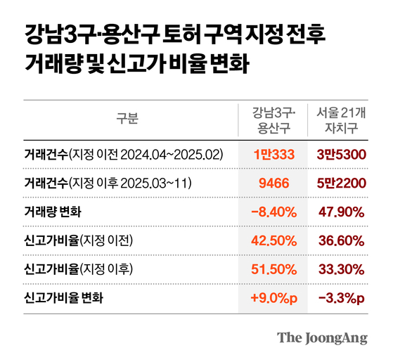 7일 신한투자증권이 강남3구·용산구의 토허 구역 지정 전후 거래량과 신고가 비율을 분석한 결과, 거래량은 규제 이전 1만333건(2024년 4월~2025년 2월)에서 규제 이후 9466건(2025년 3월~11월)으로 8.4% 감소했지만, 거래에서 신고가가 차지하는 비율은 42.5%에서 51.5%로 9.0%포인트 증가했다. 같은 기간 나머지 서울 21개 자치구의 신고가 비율은 36.6%에서 33.3%로 3.3%포인트 감소했다.