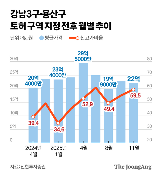 차준홍 기자 강남3구·용산구의 신고가 비율은 올 1월만 해도 전체 거래 중 34.6%였지만 규제가 나올 때마다 치솟는 양상을 보였다. 3월 24일 토허 구역 지정 후 4월 거래량은 87% 급감했지만 평균 거래가격은 29억5000만원으로 급등했다. 매물이 줄면서 일부 고가 거래가 평균 가격을 끌어올리면서다. 6·27 대출 규제 후인 7월에는 신고가 비율이 60.8%로 거래 10건 중 6건이 역대 최고가를 기록했다. 10·15 대책이 나온 10월, 11월에도 신고가 비율은 각 55.0%, 59.5%로 여전히 절반 이상이 신고가 거래다. 이에 따라 이 지역 아파트 평균 거래가격은 토허 구역 지정 이전 22억8000만원에서 23억9000만원으로 더 높아졌다.