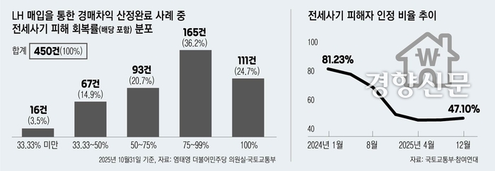 염 의원이 국토부에서 받은 자료를 보면, 지난 10월까지 피해자로 결정된 3만4481건 중 LH 피해주택 매입 완료된 건은 10%에도 못 미치는 3344건이었다. 이중 경매차익과 배당금 산정까지 끝난 가구는 450건이고, 이중 보증금을 100% 회수한 사례는 111건(24.7%)에 불과했다. 보증금의 절반도 건지지 못한 사례는 83건(18.4%)이었고, 이 중 보증금의 33%도 돌려받지 못한 경우도 16건(3.5%)이나 됐다. 염 의원과 국토부는 피해회복률이 33% 미만인 피해자의 비중이 올해 3.5%에서 내년 12%까지 늘어날 것으로 예상하고 있다.