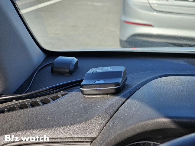 연구원 내 화성교통안전체험교육센터 주행 시험장에서 해당 장치가 부착된 시범차량에 탑승해 실제 작동 상황을 시험해봤다. 대시보드 위에 설치된 단말기에서 파란 불이 점등되면 정상적으로 작동하고 있다는 뜻이다.