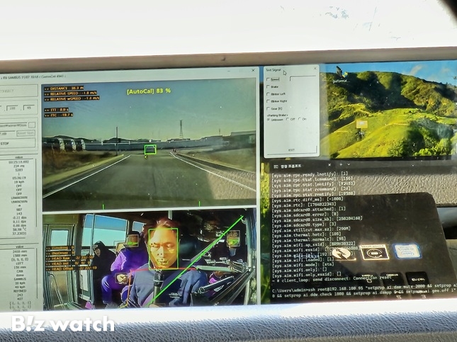대형 버스 내 장착된 인공지능(AI) 모니터링 시스템. 운전자 표정·동작 등을 인식해 위험 상황 판단 시 경고 메시지를 알린다./사진=김준희 기자 kjun@운전자 졸음·보행자 위험도 'AI가 판단해요'