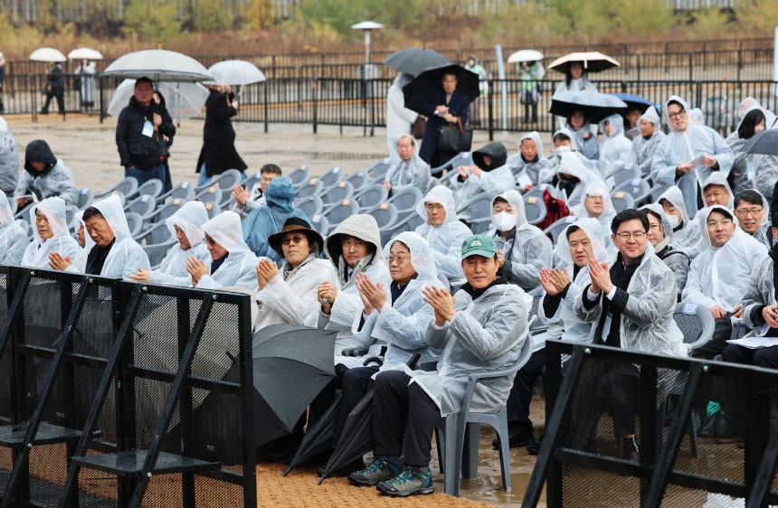 오세훈 서울시장(첫줄 오른쪽 첫번째)이 11월 27일 오후 서울 용산구 정비창 일대에서 열린 용산국제업무지구 도시개발사업 기공식에서 손뼉을 치고 있다. /뉴스1