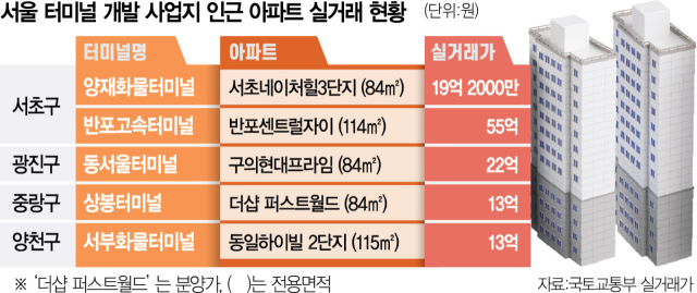 2026년에 39층 복합건물로 착공 예정인 광진구 동서울종합터미널 인근 구의동 아파트 단지는 한강변 프리미엄이 맞물리며 집값이 고공행진 중이다. 서울시 도시·건축공동위원회 심의에서 동서울터미널 계획이 확정된 올해 9월 터미널 바로 앞 자양한양아파트 전용 108.35㎡는 24억 3000만 원의 신고가에 거래됐다. 인근 현대프라임 아파트 전용 84㎡도 9월 19억 9000만 원에 매매계약이 체결된 후 10월에는 22억 원에 계약이 이뤄지며 한 달 새 2억 원이 올랐다.
