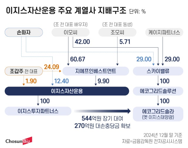 10일 금융감독원 전자공시시스템에 따르면 이지스자산운용의 완전 자회사인 이지스투자파트너스는 태양광발전사업 투자회사인 에코그리드솔라에 지난해 12월 말 기준 544억원의 장기대여금을 제공했다. 에코그리드솔라는 스카이밸류가 100% 지분을 보유하고 있는 회사(에코그리드솔루션)의 완전 자회사다. 조갑주 전 이지스자산운용 대표의 배우자 이모씨는 스카이밸류의 최대주주(지분 42.0%)다. 이지스자산운용 최대주주이자 창업주인 고(故) 김대영 전 의장의 배우자 손화자씨 역시 스카이밸류 지분 29.0%를 보유하고 있다.