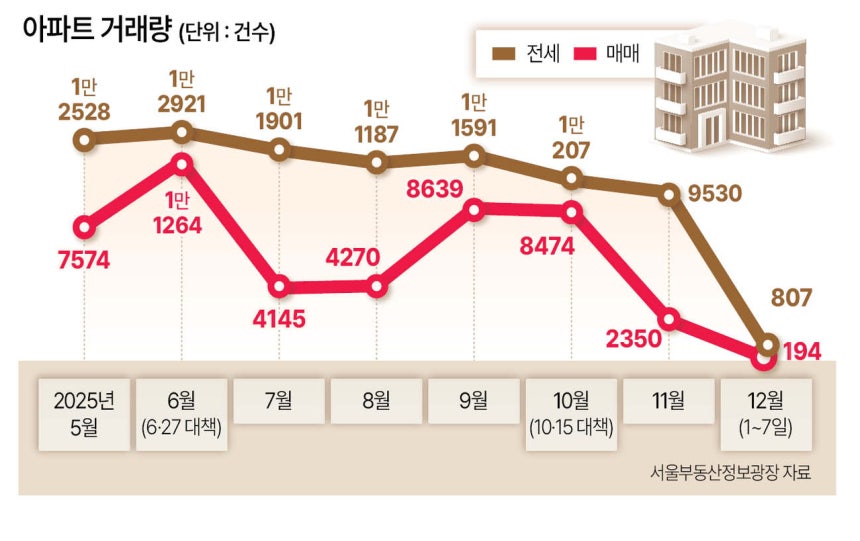서울 전역과 경기도 12개 지역이 규제지역(조정대상지역·투기과열지구)과 토지거래허가구역으로 묶인 10·15 대책 직전까지도 8000건대가 유지되다가, 대책 시행 이후 거래는 급감했다. 12월 들어서는 7일 기준 주택 매매 거래 수가 194건에 그쳤다.