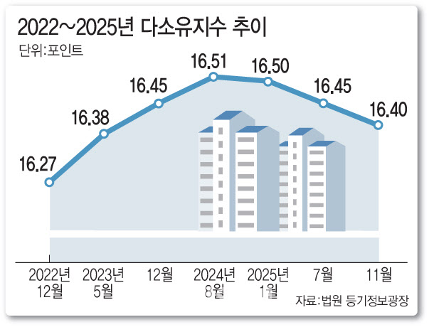 집합건물 다소유지수는 전체 소유자 중 두 채 이상을 가진 사람의 비율을 나타내는 지표다. 올해 흐름을 살펴보면 지난 1월 16.49로 시작해 △6월 16.47 △7월 16.45 △8월 16.43 △10월 16.42로 집계되며 하반기 내내 뚜렷한 우하향 곡선을 그렸다.