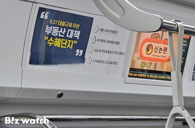 수도권 한 전철 차량 내에 붙은 규제 수혜지역 분양 광고/사진=비즈워치11일 분양업계에 따르면 용인 반도체 클러스터 인근 처인구 역북동 811 일원(신대지구 A1블록)에 조성 예정인 '용인 푸르지오 클루센트'가 이달 청약 시장에 나온다.