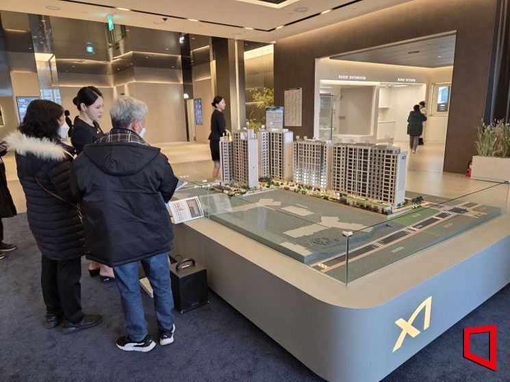 서울 강남구 대치동 '역삼센트럴자이' 견본주택에 설치된 모형도를 방문객들이 살펴보고 있다. 이정윤 기자
