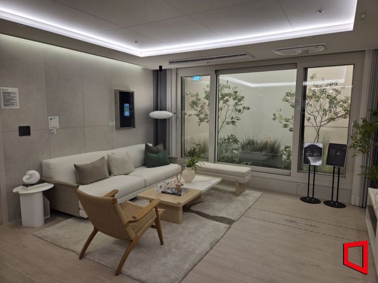 역삼센트럴자이 전용면적 84㎡ 거실 모습. 이정윤 기자견본주택에는 전용면적 84㎡, 122㎡ 내부를 볼 수 있는 공간이 마련됐다. 특히 일반분양 가구수가 많은 84㎡에 사람들이 몰렸다. 베란다와 화장실, 부엌 등을 꼼꼼히 살폈다. 특히 드레스룸의 수납공간에 관심을 보이는 여성이 많았다. 오픈 발코니 설계로 실사용 공간은 넓어 보였다. 음식물쓰레기 처리기와 창고도 무상으로 설치되고, 스마트 사물인터넷(IoT) 시스템을 적용해 조명·난방 제어 등을 할 수 있도록 했다. 방범형 도어폰과 안전사고 조기경보 시스템 등 보안 설비도 돋보였다.