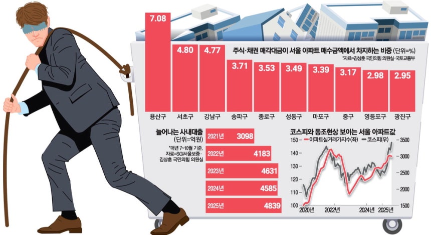 최근 정부 정책은 부동산에서 주식시장으로 자산 이동을 유도하기 위해 주담대를 막는 방향으로 진행되고 있다. 하지만 전문가들은 생산적 투자로 자본 흐름을 유도하려면 더 정교한 정책이 필요하다고 주장한다. 주식시장과 부동산시장의 연동성이 갈수록 강해지고 있기 때문이다. 오지윤 명지대 경상·통계학부 교수는 "2023년부터 서울 아파트와 주식시장 간 동조화가 심해지고 있다"며 "서울에 신규로 유입되거나 갈아타기 수요를 지닌 젊은 층 중에서 금융시장 접근성이 높은 사람이 많기 때문으로 추정된다"고 말했다.