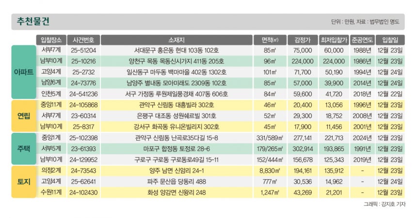 서울 마포구 상암동 1743번지 상암월드컵파크 아파트 1205동 703호가 경매에 나왔다. 하늘초 북서쪽 인근에 소재한 물건으로 9개동 380가구의 단지다. 2010년 10월에 입주했다. 13층 건물 중 7층으로 남동향이며 114.7㎡(46평형)의 4베이 구조로 방이 4개다. 월드컵북로, 가양대로 등을 통해 차량 진·출입이 수월하다. 하늘초, 상암중, 상암고 등이 단지 인근에 있다. 감정가 13억9000만원에서 한 차례 떨어져 11억1200만원에 매각이 진행된다. 등기부 등본상 근저당 1건, 가압류 3건, 압류 6건 등은 매각 후 잔금 납부 시 소멸된다. 소유자가 거주하고 있어 매각 시 인도부담이 적다. 시세는 12억원에서 13억4000만원에 거래되고 전세가는 7억2000만원에서 7억9000만원 선이다. 매각일자는 2025년 12월 23일 서울서부지방법원 경매 7계다. 사건번호 25-51322