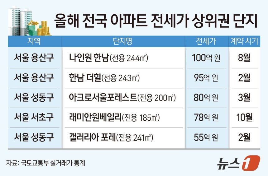 ⓒ News1 양혜림 디자이너(서울=뉴스1) 오현주 기자 = 올해 전국에서 전셋값이 가장 비쌌던 아파트는 서울 용산구 한남동의 초고급 주거단지 '나인원 한남'으로 나타났다. 전용면적 224㎡가 전세 보증금 100억 원에 계약되며 전국 아파트 전세가격 사상 최고가를 기록했다.