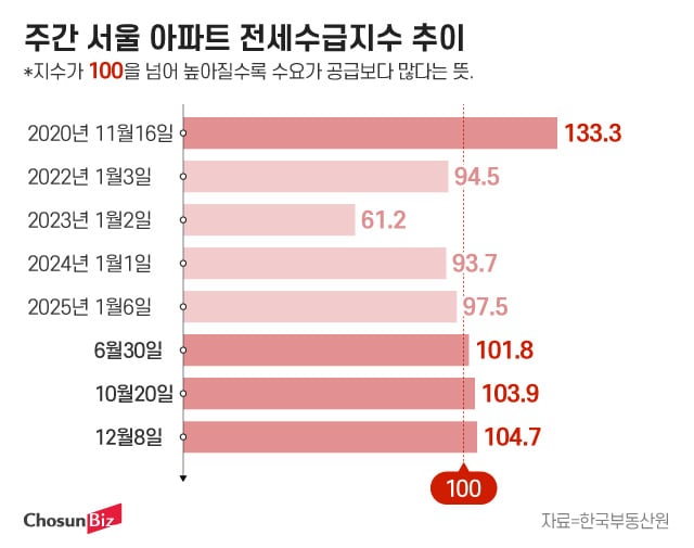 15일 한국부동산원에 따르면 12월 둘째 주(8일 기준) 서울 아파트 전세수급지수는 104.7을 기록했다. 전세수급지수는 전세 수요와 공급의 우위를 0~200 사이의 숫자로 나타내는 지표로, 100 초과 시 수요가 공급보다 많다는 뜻이다. 서울 아파트 전세수급지수는 지난 5월 중순까지만 하더라도 100을 밑돌았으나, 이후 오름세를 지속하다 10·15 부동산 대책 발표 이후 상승 폭이 커졌다.