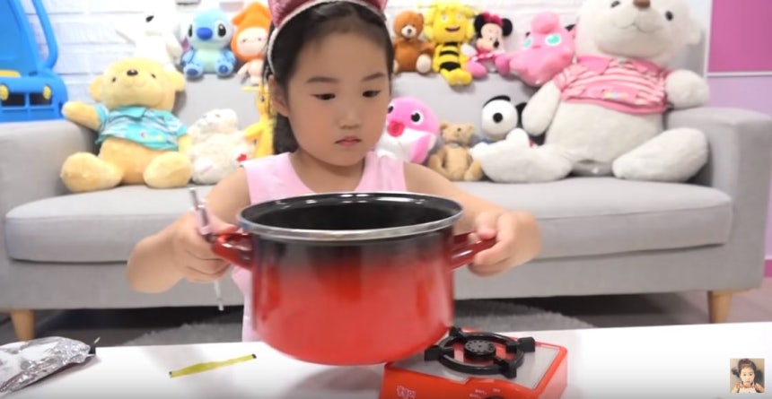 보람이의 아빠 삼촌 몰래 라면 끓여 먹기 주방놀이라는 제목의 유튜브 영상. [보람튜브 브이로그 갈무리]