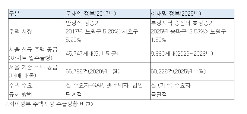 사진=심형석 우대빵연구소 소장아파트 신규 입주물량 감소도 큰 문제입니다. 부동산 지인은 문재인 정부 5년간 서울 아파트 입주물량이 연평균 4만5747가구였던 것으로 집계했습니다. 반면 이재명 정부 집권 3년(2026~2028년) 평균 입주물량은 9880가구로 떨어집니다.