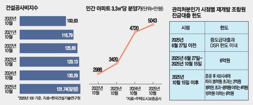 문제는 공사비가 계속 올라 조합들의 분담금이 점점 늘어날 수밖에 없다는 데 있다. 한국건설기술연구원 공사비원가관리센터에 따르면 올해 10월 건설공사비지수는 131.74로 잠정 집계됐다. 이 지수는 2020년을 기준(100)으로 하는데 2022년 125.60, 2023년 129.13 등을 기록하며 매해 상승세를 보였다.