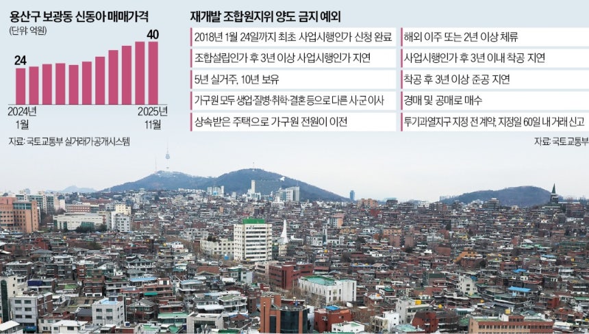 조합설립인가 후 3년 이상 사업시행인가 지연 외에 5년 실거주·10년 보유 물건도 조합원 지위 양도가 가능하다. 가구원 모두 생업, 질병, 취학, 결혼 등으로 다른 시·군으로 이사하는 경우도 규제 예외에 해당한다. 이와 함께 상속받은 주택으로 가구원 전원이 이전 △해외 이주 또는 2년 이상 체류 △사업시행인가 후 3년 이내 착공 지연 △착공 후 3년 이상 준공 지연 △경매 및 공매로 매수 △투기과열지구 지정 전 계약하고, 지정일로부터 60일 이내에 부동산 거래 신고를 완료한 경우에는 매도 때 조합원 지위를 양도할 수 있다.