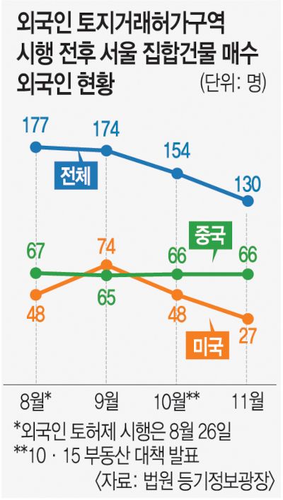 실상은 별다른 영향을 미치지 않은 것으로 분석된다. 외국인 토허제 시행 직후 한 달간은 매수세 변화가 크지 않았다(8월 177명→9월 174명). 이 기간 미국인 매수자는 오히려 늘었다(48→74명). 10·15 대책 이후 시장에 관망세로 접어들자 외국인 매수자도 10월(154명)과 11월(130명)에 감소세를 보였다. 박원갑 KB국민은행 부동산수석전문위원은 “중국인 등 외국인의 국내 부동산 매수 비중은 크지 않아 시장에 영향을 끼치긴 어렵다. 여론이 확대되며 부풀려진 측면이 있다”고 말했다.