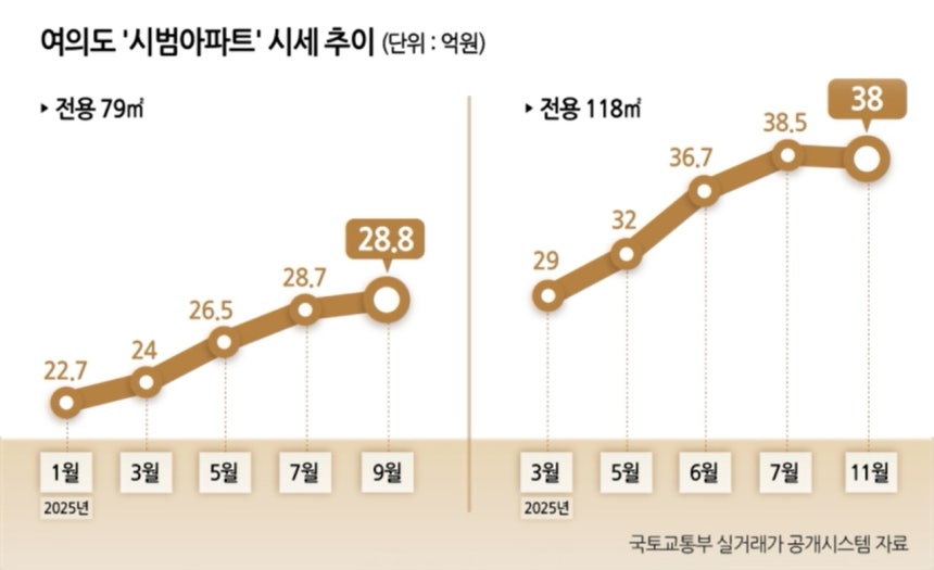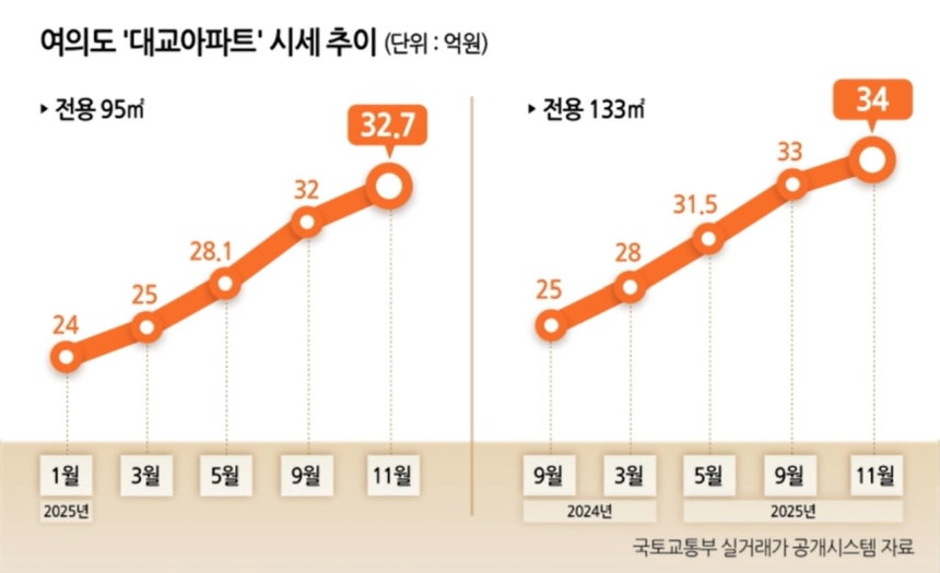 가격 흐름도 강세다. 국토교통부 실거래가 공개시스템에 따르면 대교아파트 95㎡(이하 전용면적)는 지난 11월 6일 32억7000만원(5층)에 거래됐다. 공급평수가 30평인걸 고려하면 평당 1억원이 넘는 거래가 체결된 셈이다. 여의도는 2021년 4월부터 토지거래허가구역으로 지정돼 있어 실제 거래 시점은 계약 체결 이후 약 한 달의 시차가 발생한다.