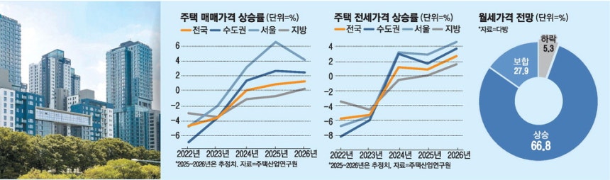 내년에 전세뿐 아니라 월세 가격까지 상승할 것이란 설문조사 결과도 나왔다. 부동산 정보 플랫폼 다방이 애플리케이션(앱) 이용자 2123명을 대상으로 조사한 '2026년 전월세 시장 전망'에 따르면 내년 월세 가격이 오를 것이라고 응답한 비율은 전체의 66.8%였다. 전세 가격 역시 상승 전망 비중이 가장 높았는데, 다방이 2023년 설문조사를 실시한 이래로 전월세 가격 모두 상승 전망이 우세한 경우는 이번이 처음이다.