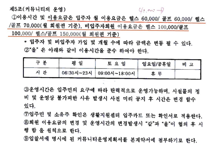 상호 변경 계약 과정에서 계약이행보증금은 기존 1억원에서 3000만원으로 대폭 축소됐고, 입주민 이용료는 입주자 협의나 동의 없이 기존 월 4만원에서 월 6만원(헬스 6만원, 골프 6만원, 헬스·골프 7만원)으로 50%가량 인상됐다.