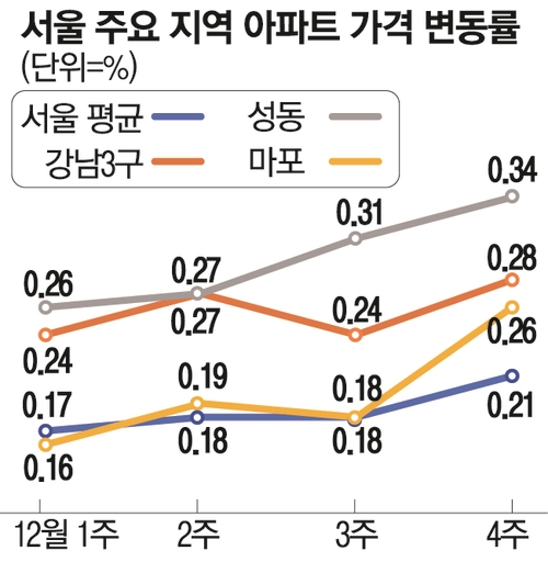 서울 역시 전주 0.18%에서 0.21%로 오름폭이 커졌다. 상승폭으로는 10월 넷째주(0.23%) 이후 8주 만에 가장 높다. 경기는 0.1%에서 0.12%로, 인천도 0.03%에서 0.04%로 상승폭이 늘었다.