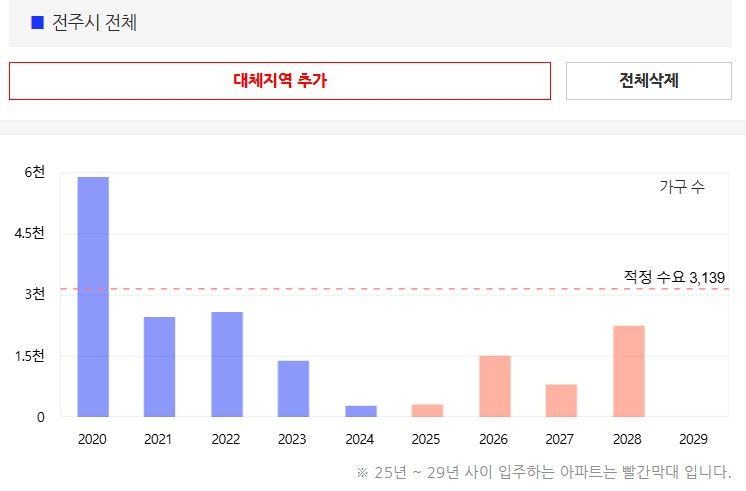 더불어 익산과 군산지역에는 과잉 공급의 충격이 아직 남아 있다. 아실에 따르면 올해 익산의 아파트 공급 물량은 5765가구로 적정 수요(1336가구) 대비 4.3배 가까이 많았다. 군산 또한 올해 입주 물량(2583가구)이 적적 수요(1282가구) 대비 2배로, 내년에도 이 같은 추세(2503가구 예정)가 이어질 것으로 전망된다. 반면 전주는 적정수요(3139가구) 대비 입주 물량이 ▷2024년 245가구 ▷2025년 277가구로 부족했고 내년(1493가구 예정)도 공급부족이 예정돼 있다.
