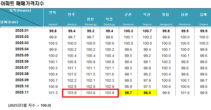 아파트 공급 물량표. [아실]한국부동산원의 전국주택가격동향조사에 따르면 익산은 올해 1월 전북 내에서 아파트 매매가격지수가 100.7(3월지수=100)로 가장 높았으나, 11월 96.9으로 떨어졌다. 반면 같은 기간 전주는 99.4에서 103.9로 오르며 전북 시세를 주도했다. 1월 100.3이었던 군산 또한 지난달 98.7로 지수가 하락했다. 전북에서 지난달 기준 지수가 100을 넘는 곳은 그 외에는 남원(101.6)이 유일하다.