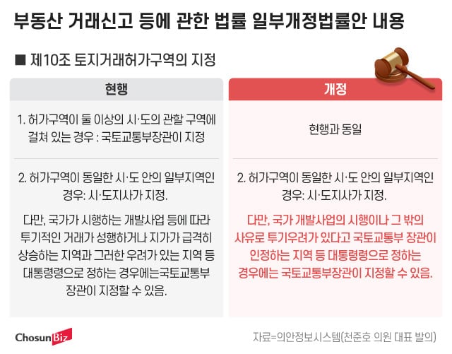 이 때문에 지자체장에게 동일 시·도 내 토허구역 지정권을 부여하되, 예외적으로 투기 우려가 있다고 인정되는 지역에 한해 국토부 장관이 토허구역으로 지정할 수 있도록 하는 부동산 거래신고법 개정이 정부와 여당 주도로 추진되고 있다. 집값 급등 시 국토부 장관이 곧바로 토허구역 지정 카드를 꺼낼 수 있도록 하기 위한 것이다.