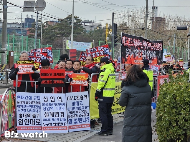 지난 15일 열린 대장홍대선 착공식 현장 앞에서 상암역 및 홍대입구역 역사 위치 이전을 요구하는 단체들의 집회가 진행되고 있다./사진=김준희 기자 kjun@마포구 "DMC역 만들고 상암역 옮겨야"