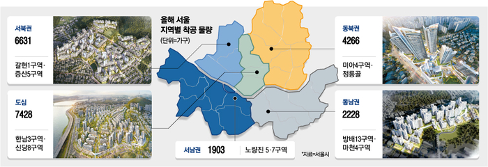 1일 서울시에 따르면 올해 서울 내 민간 재건축·재개발 사업지 14곳에서 2만2456가구가 첫 삽을 뜬다. 지역별로 도심이 7428가구로 가장 많고 서북권(6631가구), 동북권(4266가구), 동남권(2228가구), 서남권(1903가구) 등 순이다. 도심을 비롯해 강북 전체 착공 물량이 1만8325가구로 강남(4131가구)보다 약 4.4배 많다.