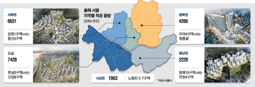 1일 서울시에 따르면 올해 서울 내 민간 재건축·재개발 사업지 14곳에서 2만2456가구가 첫 삽을 뜬다. 지역별로 도심이 7428가구로 가장 많고 서북권(6631가구), 동북권(4266가구), 동남권(2228가구), 서남권(1903가구) 등 순이다. 도심을 비롯해 강북 전체 착공 물량이 1만8325가구로 강남(4131가구)보다 약 4.4배 많다.