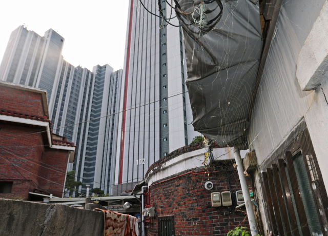 서울 노원구 상계5구역의 노후 주택 너머로 노원롯데캐슬시그니처(상계6구역) 아파트 단지가 보이는 모습. 뉴스1