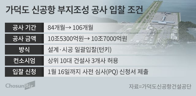공사 금액도 기존 10조5300억원에서 10조7000억원으로 늘렸다. 설계·시공 일괄입찰(턴키) 방식은 그대로 유지했다. 또 공동계약 시 시공 능력 평가 상위 10대 건설사의 공동수급체(컨소시엄) 구성을 3개 사 이내로 허용하기로 했다.