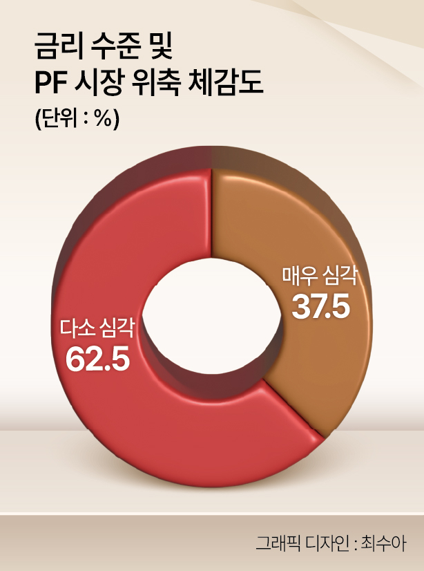 부동산 시장의 침체 국면을 예상한 요인으로는 ‘금리’ 등 대내외적 경제지표의 불확실성이 꼽혔다. CEO에게 최근 금리 수준과 PF 시장 위축 등을 체감하는 정도를 묻자 62.5%(10명)가 ‘다소 심각’을 응답한 것으로 집계됐다. 다음으로 37.5%(6명)는 ‘매우 심각’하다고 답했다. 설문참여 CEO 전원이 자금조달이 쉽지 않다고 답한 것이다.