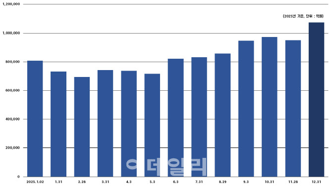 2025년 1월 2일 기준 증권사 예수금은 80조7875억원이었으나, 12월 31일 기준 107조3795억원으로 증가했다. 단 1년 만에 약 26조원의 현금이 주식 시장 안에 새롭게 쌓인 것이다. 이는 단순한 평가이익이 아니라, 매매를 통해 실현된 자금이 예수금 형태로 시장에 남아 있음을 의미한다. 즉, 이미 벌어 놓은 돈이다.