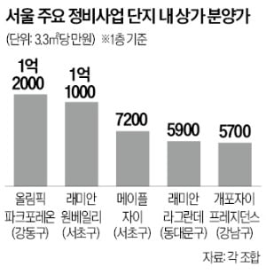 강동구 올림픽파크포레온 ◇미분양 걱정에 ”짓지 말자”조합원 간 갈등을 극복하고 상가를 새로 지어도 미분양 난관이 기다리고 있다. 4066가구 규모인 강동구 ‘고덕 아르테온’은 3층 규모의 상가 내 학원시설을 놓고 매각에 어려움을 겪고 있다. 이 상가는 2020년 지하 2층~지상 3층, 연면적 1722㎡ 규모로 준공됐다. 그러나 아직 주인을 찾지 못해 조합은 매각 공고를 반복하고 있다. 지난해 11월 입찰 기준가는 127억3100만원이었다. 그러나 잇단 유찰로 지난 3월 공고에선 입찰 기준가가 75억1761만원까지 하락했다.강남 3구(강남·서초·송파구)도 사정은 마찬가지다. 서초구 ‘래미안 원베일리’는 상업용 부동산 시장이 얼어붙으며 조합이 통매각을 진행했다. 인근 서초구 ‘메이플자이’는 통매각에 실패해 원베일리를 분양한 업체를 통해 일반분양에 나섰다. 상가 1층의 계약 평균단가는 최고 7500만원 수준으로 원베일리보다 다소 낮았다. 그러나 상가 크기가 커 실제 분양이 어려울 수 있다는 우려도 있다.