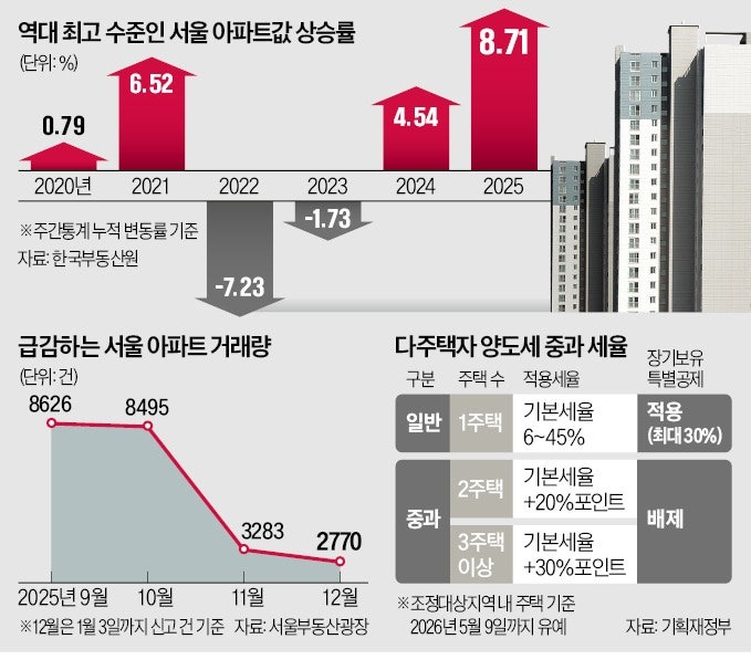 다주택자 양도소득세 중과세가 4년 만에 재개될 가능성이 커졌다. 정부가 조만간 발표할 ‘2026년 경제성장전략’(옛 경제정책방향)에 양도세 중과 유예 조치가 빠진 것으로 4일 확인됐다. 유예가 종료되는 오는 5월 전에 다주택자의 주택 매도를 유도하겠다는 취지지만, 서울 전역과 경기 12곳이 토지거래허가제로 묶인 상황에서 양도세 중과까지 부활하면 ‘거래 실종’ 현상이 더 심해질 것이라는 우려가 나온다.