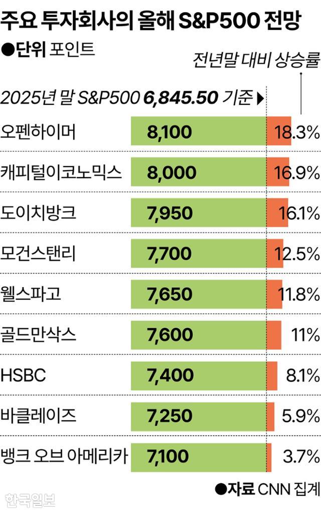 올해 말 기준으로 지수가 7,400~7,800 수준(약 8~15%)에서 움직일 것이란 전망이 가장 많았고(11곳), 8,000선을 넘어설 것이란 전망도 오펜하이머(8,100)를 포함해 3곳이나 됐다. 예측대로라면 S&P500 지수는 4년 연속 상승해 2003~2007년 이후 가장 긴 상승 기록을 세우게 된다.