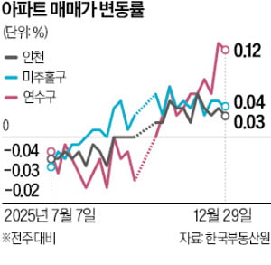 미추홀구 용현·학익지구와 연수구 송도역 역세권 단지 부동산 시장에도 온기가 감돈다. 부동산 플랫폼 아실에 따르면 미추홀구와 연수구 아파트·오피스텔 거래량은 지난해 7월부터 꾸준히 늘어 작년 11월 각각 235건, 530건을 기록했다. 지난달 9일 연수구 송도동 ‘송도아메리칸타운더샵’ 전용면적 108㎡는 15억8000만원에 매매돼 두 달여 만에 4억1185만원 올랐다. 지난해 11월 미추홀구 용현동 ‘용현자이크레스트’ 전용 74㎡는 최고가인 5억5900만원에 손바뀜해 1년 만에 1억4600만원 뛰었다.