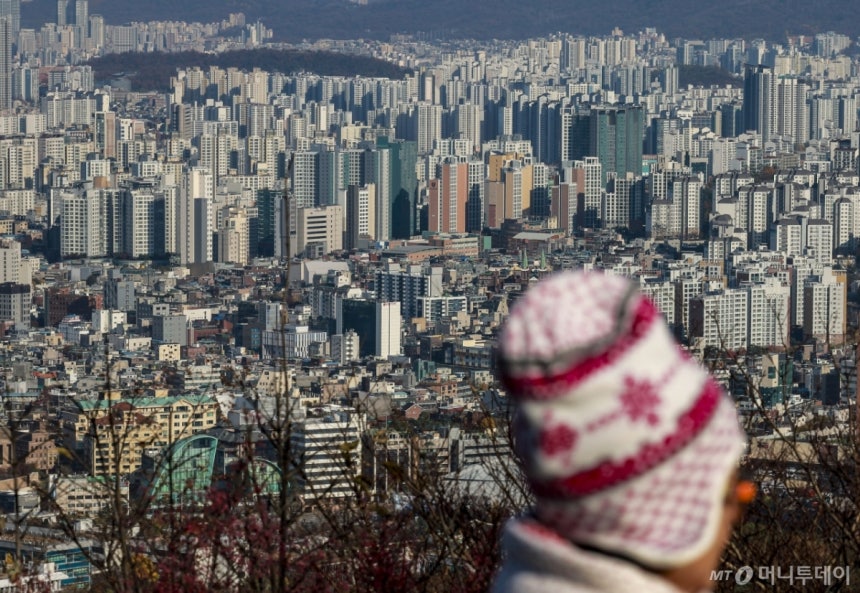 [서울=뉴시스] 정병혁 기자 = 17일 서울 남산에서 시내 아파트가 보이고 있다. 최근 은행채 금리가 올라가면서 이를 반영한 주택담보대출 금리도 가파른 우상향 곡선을 그리고 있다. 5대 은행의 주담대 5년 고정금리(주기·혼합형)는 3.74~6.04%로 집계됐다. 6개월 변동금리는 3.77~5.97%로 나타났다. 주담대 고정금리 상단이 6%를 넘어간 것은 지난 2023년 12월 이후 2년여 만이다. 2025.11.17. jhope@newsis.com /사진=정병혁#. 서울 외곽 전용면적 80㎡대 아파트에 거주하며 변동금리 주택담보대출 상품을 이용중인 40대 직장인 정모씨는 최근 대출 이자 고지서를 보고 당혹감을 감추지 못했다. 정씨의 주담대에는 3년 국고채 금리 3.01%에 가산금리 1.60%를 더한 연 4.61%가 적용됐다. 기준금리는 멈췄지만, 실제 적용 금리는 오히려 오른 셈이다. 정씨는 "기준금리 인상기에는 바로 반영되더니, 동결 이후에는 내려올 기미가 없다"며 "실거주자인데도 여전히 투자 수요 관리 대상처럼 취급받는 느낌"이라고 말했다.