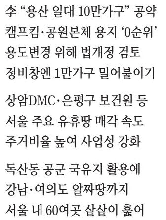정부가 조만간 발표할 추가 주택 공급 대책에서 용산 일대가 꽉 막힌 서울 주택 공급의 '물꼬'를 틀 핵심 변수로 부상하고 있다. 정부가 최근 착공에 들어간 용산정비창 용지 외에 용산공원 일부를 주택 공급 가능 용지로 검토하면서 상암DMC, 은평구 옛 국립보건원 등 서울 시내 주요 유휴 용지 활용에도 속도가 붙는 분위기다.