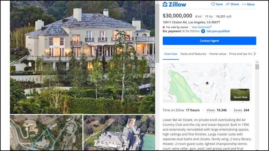 일론 머스크 벨에어 소유 주택이 인터넷 부동산 경매 사이트에 올라왔던 모습. [미국 온라인 부동산 플랫폼 질로우(Zillow) 캡처]